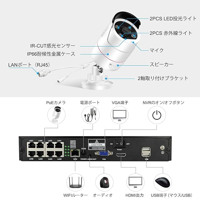 【増設用POE防犯カメラ・IP66耐候性】:本カメラはYESKAMOO増設用poe給電カメラです。poe給電なので、この防犯カメラが電源工事が不要で、コンセントの確保が難しい天井や屋外でも防犯カメラの設置ができるようになります。LANケーブル一本だけを利用してカメラに給電しながら、ビデオデータを伝達します。カメラ本体は電源不要、有線なので、安定して高画質なデジタル映像を録画装置に保存されます。この防犯カメラにはIP66防水防塵メタルケースでしっかり構造して、経年劣化に強く、雨、雪、埃などに防ぎ、屋外に対応します。