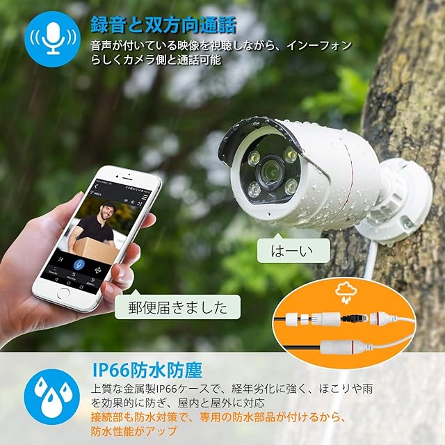 【録音・音声通話】:高感度マイクと上質スピーカーが内蔵され、監視カメラ本体を回って360°録音します。現場の音声を正確に認識して、録音音質の綺麗さを実現します。本増設用カメラはYESKAMOO POE防犯カメラセットの録画機とLANケーブルで繋がったら、すぐに使えます。HDMI/VGAケーブルより、録画機とモニターと接続して、リアルタイム音声だけでなく、保存した音声入り動画の再生も可能です、音声と録画を監視する事が実現しました。音声が付いている映像データで、夜や留守の時悪質の侵入行為を録画し、警察や弁護士へ確認する有効な証拠になります。お家の安全を保障します。
