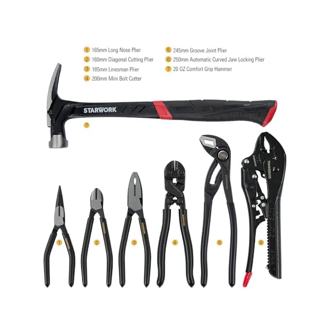 【一つで全てが揃うセット】このセットには、7インチのラインマンプライヤー、6インチの対角カットプライヤー、6インチのロングノーズプライヤー、10インチのグルーブジョイントプライヤー、8インチのミニボルトカッター、10インチの自動曲がりジョー・ロッキングプライヤー、さらに20オンスのグリップハンマーが含まれています。機能性がより包括的で、さまざまな状況での使用に適しており、整備工具に必要な全てが揃っているため、作業を効率的に進めることができます。