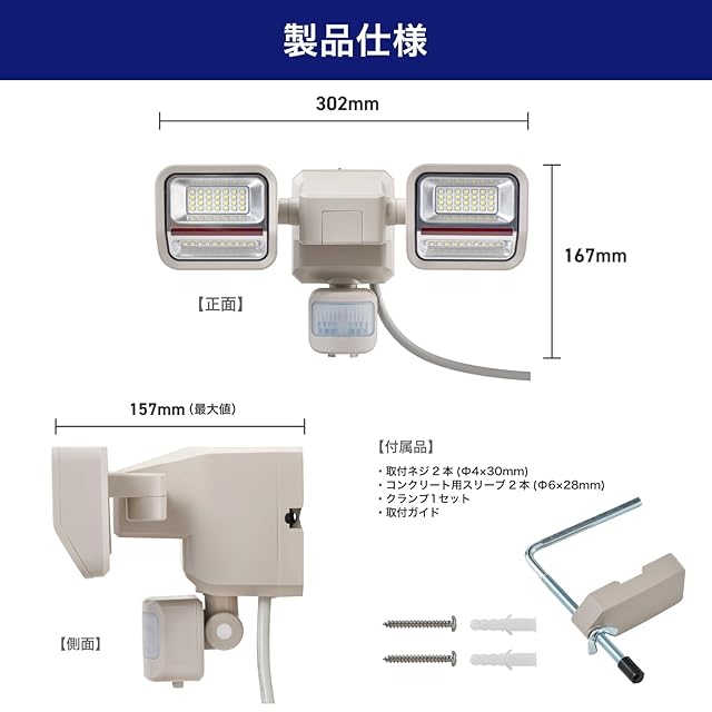 付属品:取付ネジ 2本(Φ4×30mm)、コンクリート用スリーブ 2本(Φ6×28mm)、クランプ 1セット、取付ガイド 1枚