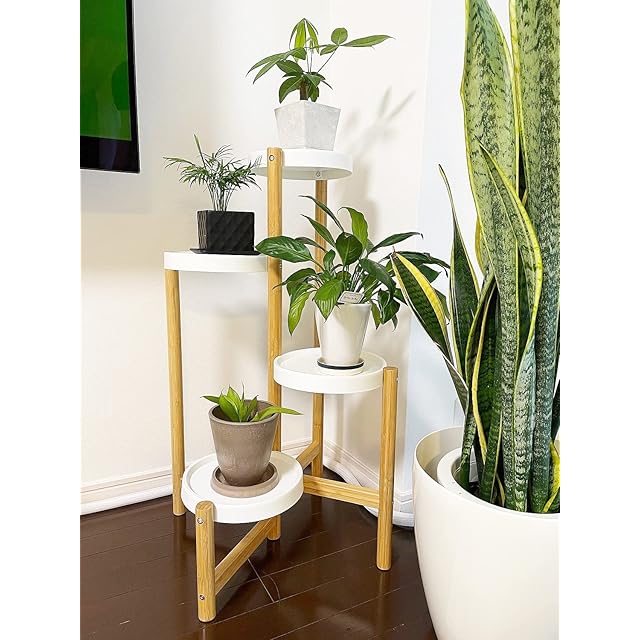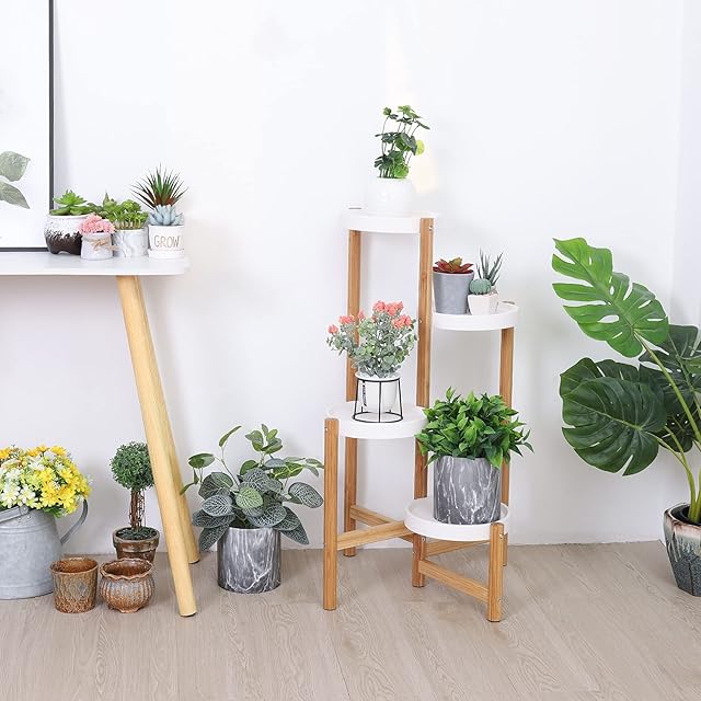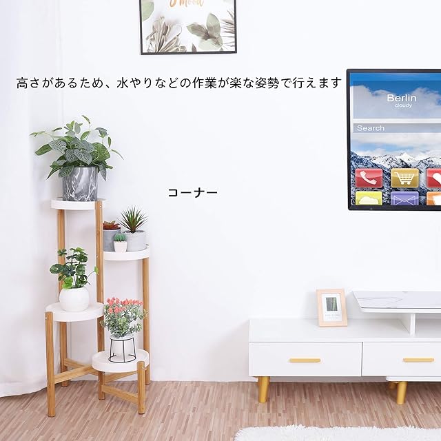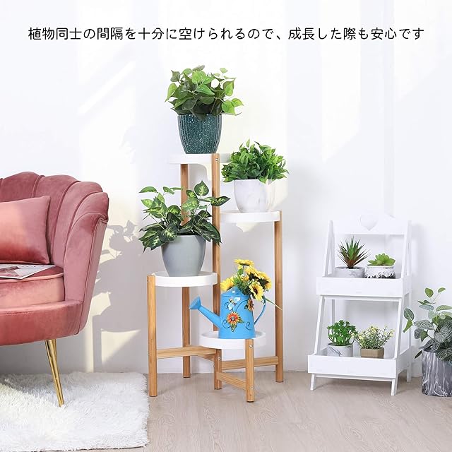 Susire フラワースタンド 高さ80cm 木製 白 室内 北欧 4段 園芸ラック 円形 竹 花瓶 大型花台 かわいい 水受け シンプル 高い リビング ガーデンラック ベランダ おしゃれ 7号鉢置き台