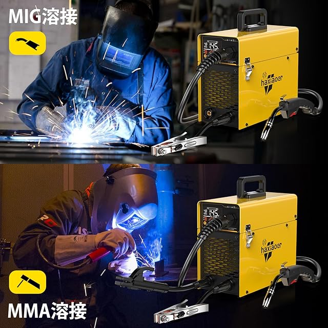 【多機能溶接】haixaoer MIG145A溶接機は1台3役電気溶接機、ノンガスMIG、リフトTIG(トーチ別売)、アーク溶接に対応する3-in-1機能を持ち、必要に応じてノンガスMIGとアーク溶接を簡単に切り替えることができます。 家庭でのDIY、屋外での修理、車の修理、農園芸用具の日常的な修理やメンテナンスに最適。 初心者からプロの溶接工まで、さまざまなユーザーのニーズに対応。たった1台で鋳鉄、軟鋼、ステンレスなど様々な金属が溶接できるのでとても便利です。伝統的な側面からワイヤを交換する溶接機と比べて、弊社のMIG145A溶接機は上部からワイヤを交換するため、腰を曲げたり体を横に傾けたりする必要がありません。操作スペースも広くて遮るものがなく、利便性が大幅に向上しています。