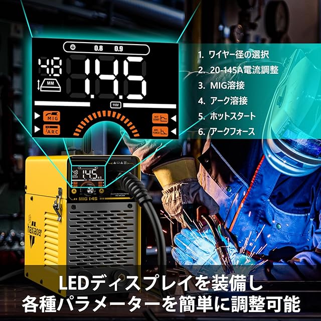 haxiaoer半自動溶接機 最大出力145A 100V専用溶接機1台3役電気溶接機ノンガスMIG/MMA溶接/LIFT TIG対応 LED液晶表示 インバーター搭載 小型 軽量 家庭用 初心者向け ノンガス溶接機 家具や雑貨DIY 簡単な修理145A100v溶接機