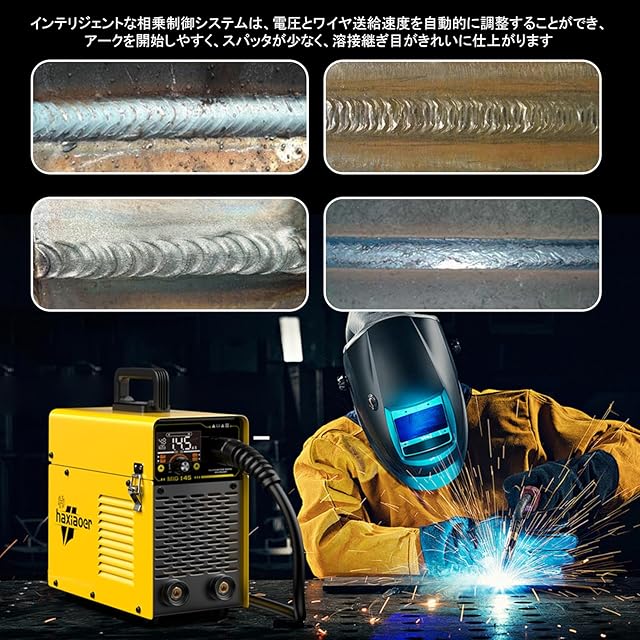 【溶接の初心者でも使いやすい】haixaoer MIG のインテリジェント協同制御システムは、溶接ワイヤの直径(0.8mm/0.9mm/1.0mm)またはアンペア数(20~145A)を変更すると、自動的に電圧とワイヤ送り速度を調整します。最大145Aの溶接出力を持って、6mm程度の厚板もしっかり溶接可能です。それは設定された電流に応じて最適なワイヤ送り速度を自動的に調節し、また被溶接材の厚さと自動的にマッチングすることができます。初心者でも便利に利用することができます。