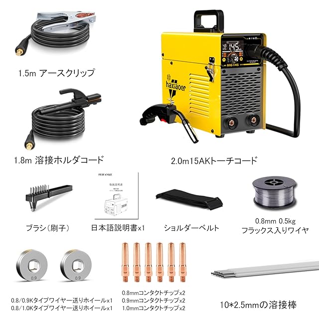 【保証・日本語取扱説明書付】付属品には、溶接機本体、2.0m15AK溶接トーチ、1.8溶接ホルダー、1.5m接地クランプ、溶接ワイヤー(1巻含み0.8mm/0.5kg)、2.5mm溶接棒10本、導電ノズル10個(0.8mm/2個、0.9mm/2個、1.0/)、保護ノズル2個、スチールブラシ1個、日本語取扱説明書。これは完全な溶接キットである。(ご注意:LIFT TIGトーチは含まれておりません)、購入日から2年間の保証サービスを提供し、より信頼性の高いアフターサポートをお届けします。弊社の製品は出荷前に全て検査して、無異常ことを確認済みで出荷しております。万が一汚れ、不良、破損等の問題がありましたら、ご連絡頂ければ必ず24時間内に対応致します。