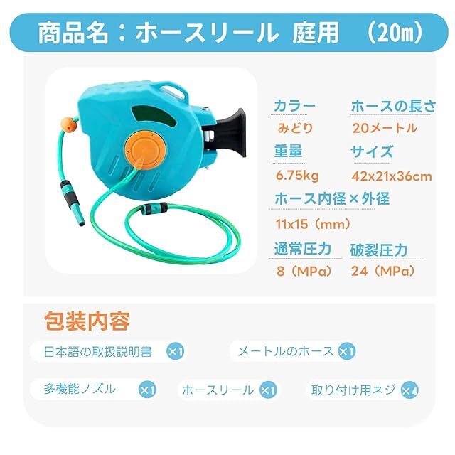 Kurflo 壁掛/ポータブル 庭用 (20m)ホースリール 自動巻き戻し 多機能ノズル付き ホースリール 180°回転ブラケット付き 広範囲角度対応 ガーデンホース 散水ホース