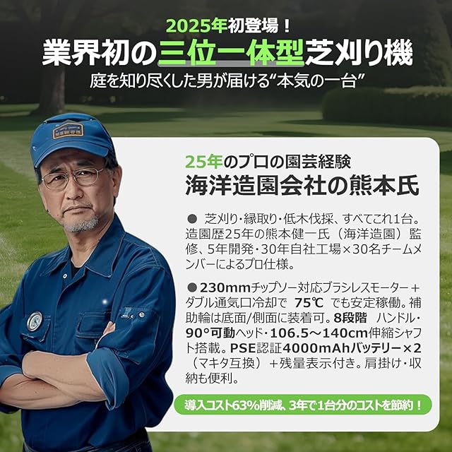 【海洋造園会社&熊本先生監修】MJUM多機能草刈機は海洋造園会社の園芸工具専門家、熊本先生とそのチームが監修・開発し、PSE認証を取得。製品の品質と安全性を保証します。ご購入後は3年間の製品保証と無償交換サービスが付帯しており、安心してご使用いただけます。付属品も充実しており、草刈機本体、4000mAhバッテリー2個、電源アダプター、230mm円形鋸刃、205mm円形鋸刃、230mm合金刃2枚、草刈ディスク、草刈コード10本、草除け板、補助車輪、作業用手袋、保護メガネ、組立キットが含まれています。商品到着後は必ず同梱のわかりやすい日本語取扱説明書をご確認いただくか、商品画像の2番目にある組立動画もご参照ください。付属品の不足や使用中のお困りごとがございましたら、いつでもアフターサービスへご連絡ください。日本国内のスタッフが電話やメールで専門的なサポートをいたします。