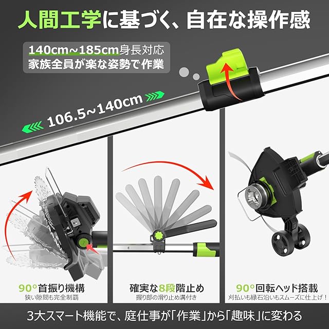 充電式草刈り機【独自の草巻き防止構造 2025年新登場 1台3役 草刈り・縁刈り・灌木切断 熊本氏監修】21Vコードレス電動草刈機 両用補助輪 衝突防止 ブラシレスモーター 刈刃径230mm 電量表示 PSE認証 4000mAhバッテリー2個 マキタ互換 替刃3種 8段階調整補助ハンドル 可伸縮 最長140cm 90度調整ヘッド 肩掛けバンド 軽量 低騒音 安全 女性 芝生 雑草 庭 畑 空き地
