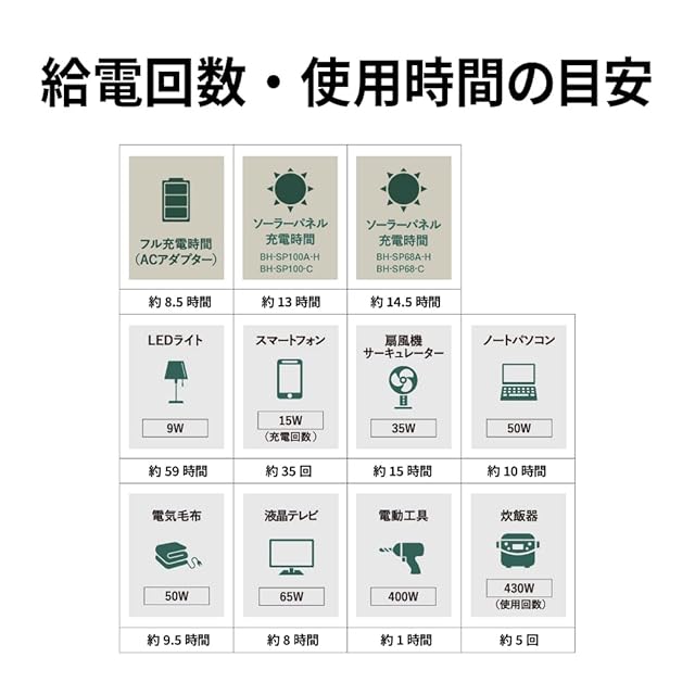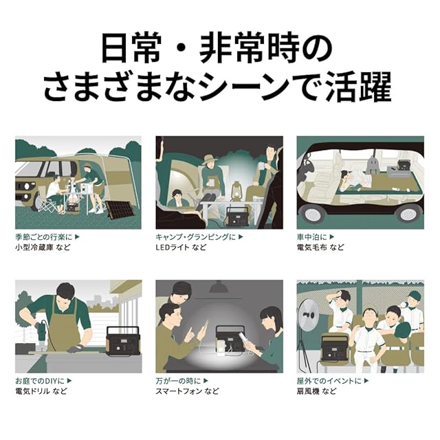 AC出力:100V/5A/60Hz 500W (瞬間最大1,000W) USB出力:最大36W DC出力:最大120W(DC12V/10A シガーソケット)