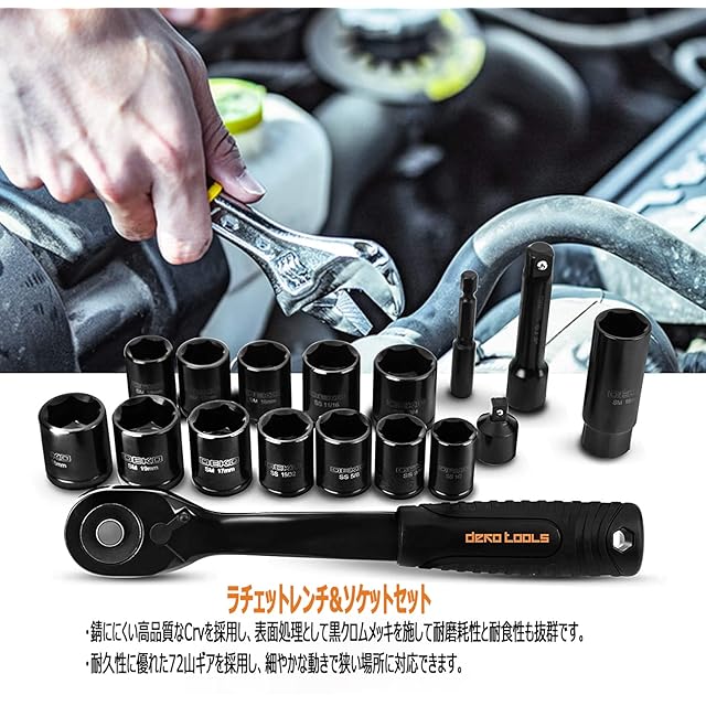 【耐久性に優れた道具セット】作業工具セットは高品質のCRVで仕上げられながら、表面処理として黒クロムメッキを施しており、耐腐食性に優れ、錆びにくく、高強度で耐久性に優れ、長く使うことができます。