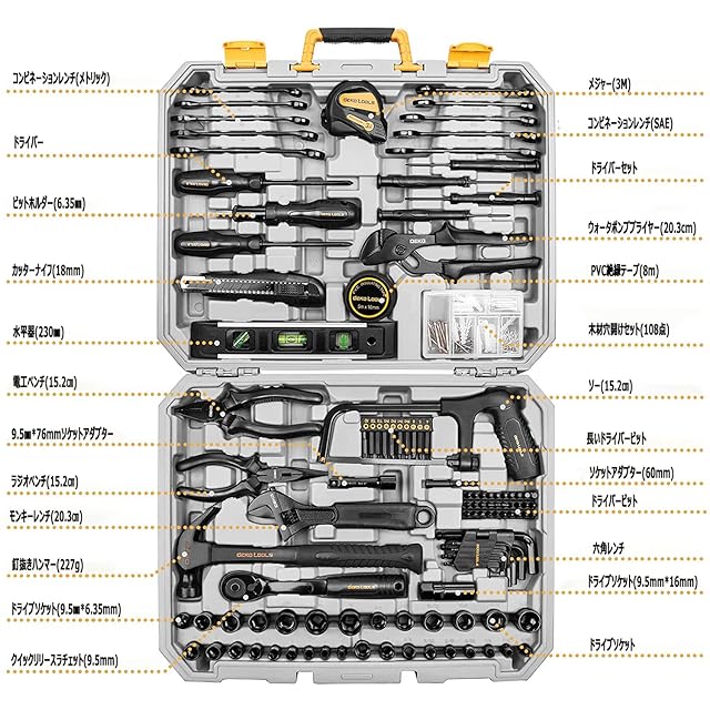 【驚くほどの工具セット】ホームツールセットは使用頻度の高い218点セットをワンセットに揃えるし、人間工学に基づいた設計も採用するし、使い勝手がとても良いです。詳しいセット内容は画像または詳細ページの内容をご覧ください。