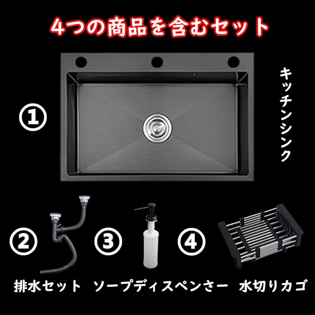 【商品仕様】パッケージ内容:シンク本体、排水セット、ソープディスペンサー、水切りカゴを含まる。(注:蛇口は付属しておりませんので、お客様は自分で購入してください。)