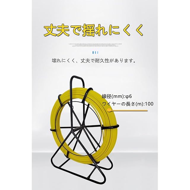 【通線ロッド100m】長さ100m、径が6.0mmのワイヤーなので細くて長い電線管でも対応可能。ロッドはFRPで作られた通線ロッドで、狭いダクトなどから容易に通線できます。