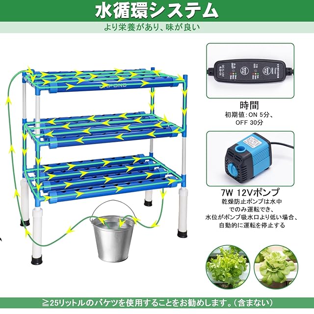 【高品質と高い収量】高品質青色食品レベルのPVC製で、パイプ内の藻の繁殖を抑制し、屋内外での長期使用を保証します。栄養液による無肥料栽培は、作物の生産能力を満たすことができます。酸素を含んだ水と栄養分を直接根に輸送され、野菜により栄養価の高い、風味豊かを持たせる。従来の土耕栽培に比べ、少ない水と少ないスペースで、収穫量を2倍にすることができます。進化した水耕栽培キットは、PVCチューブではなくフレキシブル黒いホースを出水口として使用することで、ホースの藻の成長を抑制します。調節が容易のため、バケツを制限なくどこにでも置くことができます。(推奨≧25リットルのバケツ)。