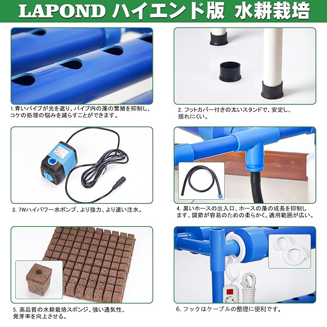 【LAPOND 高級版】水耕栽培システム 4列3層 青い食品級PVC-U管水耕栽培キット 108穴 水耕栽培植物用 自動水循環システム搭載 藻の繁殖を抑制 水耕栽培野菜/果物/ハーブ/花など 家庭菜園 室内 ベランダ 庭 (日本語説明書付き)