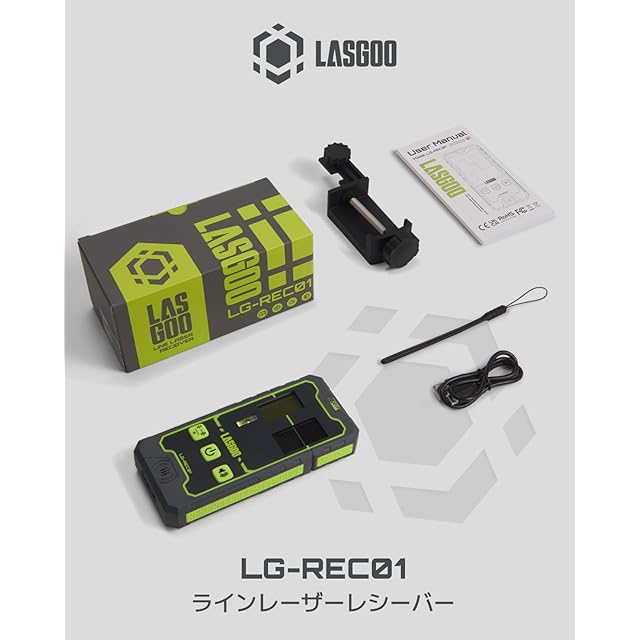 パッケージに含まれるもの 1x LG-REC01レーザーレシーバー、1x Type-Cケーブル、1xクランプブラケット、1xユーザーマニュアル