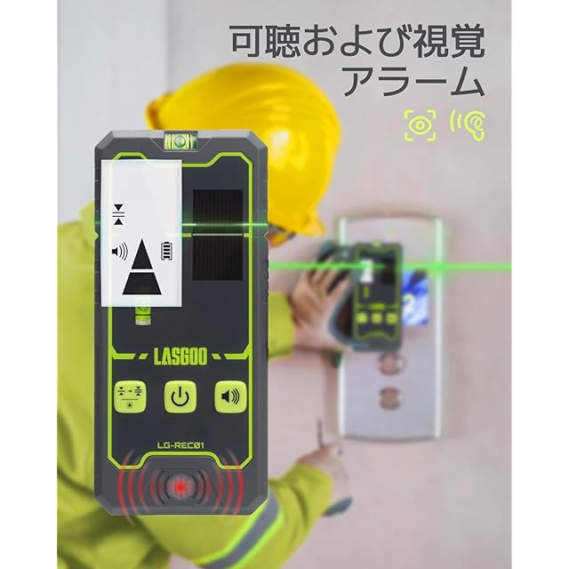 LasGoo LG-REC01 レーザーレベル用レシーバー、デュアルLCDディスプレイ&バブルレベル、パルスラインレーザー用グリーン&レッドレーザービームディテクター、最大50m、充電式バッテリー内蔵、クランプ付属