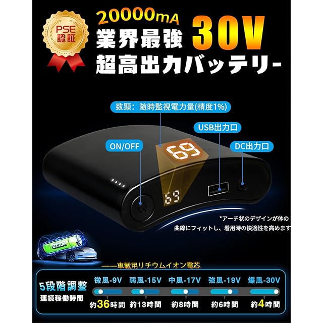 【30Vファン付き作業服用バッテリー】30V超強力パワー20000mA大容量、急速充電・電池残量表示付き、5段階調節、DC3.5インターフェースの充電器が必要(充電器とバッテリー)