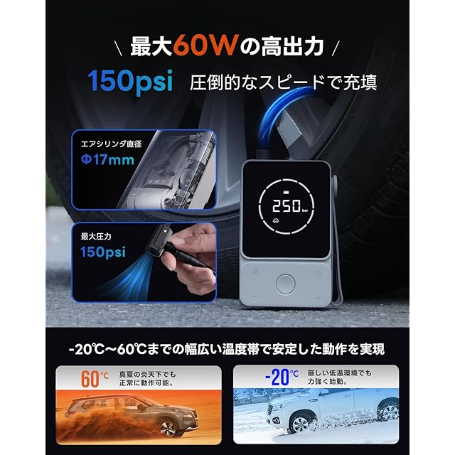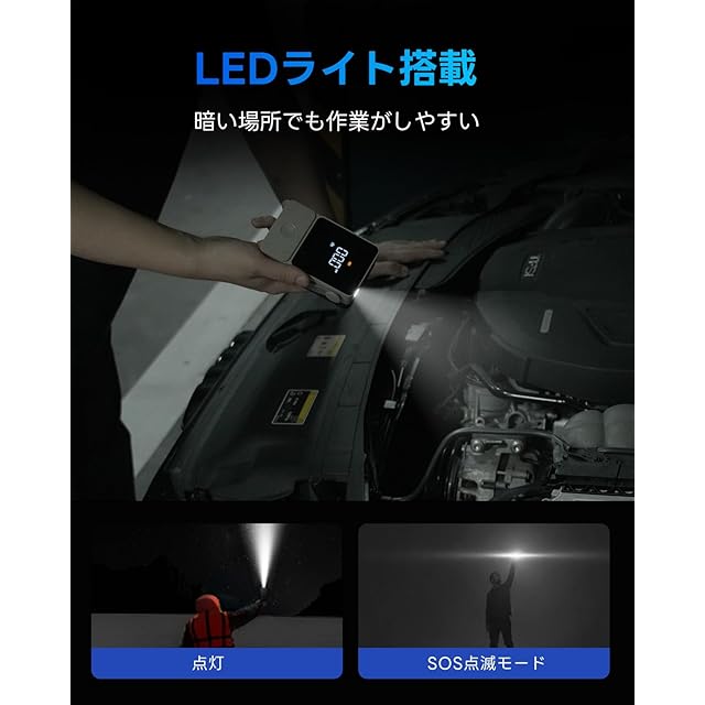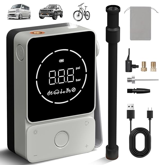 【初心者ても使えるくらい簡単さ】 ①エアーホースが本体に直接収納できる仕様。②大画面のタッチパネルは数値が見やすい。 ③LEDライト搭載で薄暗い庫内や夜でも作業性向上。 ④日本語の取扱説明書を付属し、日本人カスタマーサポートチームで問い合わせにもしっかり対応できます。 ⑤収納袋付きで付属品や充電ケーブルをまとめて収納。 ⑥充電ケーブルはType-Cのため汎用性があります。