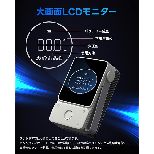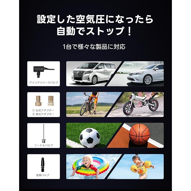 【5種類ノイズ&6つモード】 仏式・英式の2つタイプに対応したことだけでなく、クイックリリースバルブ、変換バルブ、ニードルバルブもあります!自転車・ロードバイク・自動車・バイク・ママチャリ・車椅子など使用可能。ボール・浮き輪などにも使えるので汎用性が高く便利です!通勤通学・アウトドア・運動・夏の海などいろんなシーンに活躍。それぞれの空気圧を管理できる6種類のモード付き、推薦モードは自動車、バイク、自転車、ボール、電動キックに対応し、初期値が設定されています。具体的な空気圧が分からない初心者でも安心して使えます。実際に応じて設定空気圧を調整することもできます。カスタマモードでは指定した空気圧を記録可能です。
