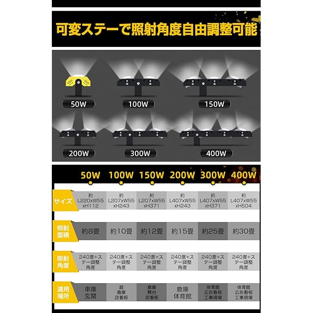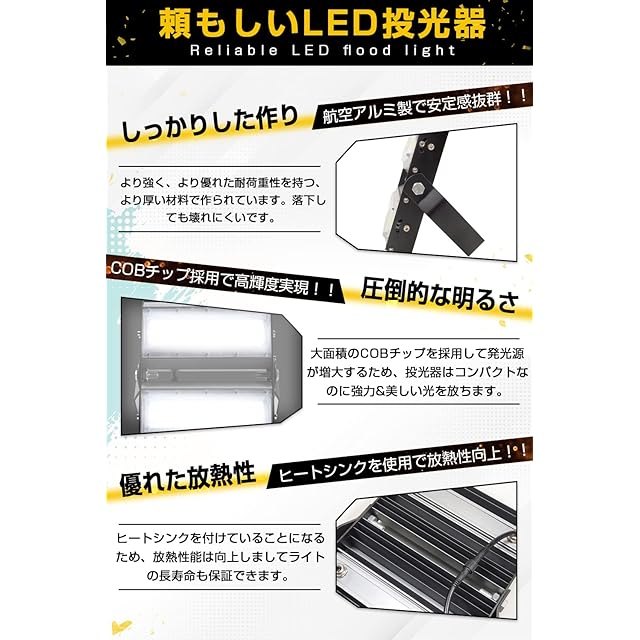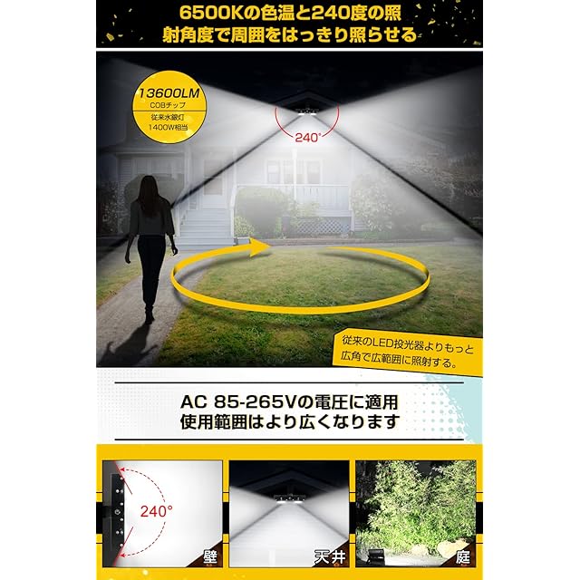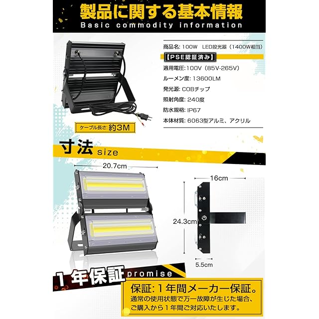 ◆規格:●チップ:COBを採用、極薄型100W投光器1400Wに相当●接続線:3メートル●電圧:85-265V●光束:13600ルーメン●色温度6500K(昼光色)●重さ:1.8kg●放熱設計:6063型アルミ材質と櫛形ヒートシンク