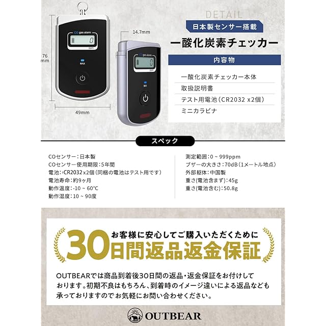 【日本製センサー搭載】 一酸化炭素チェッカー 日本製 センサー 一酸化炭素検知器 キャンプ 車中泊 OUTBEAR