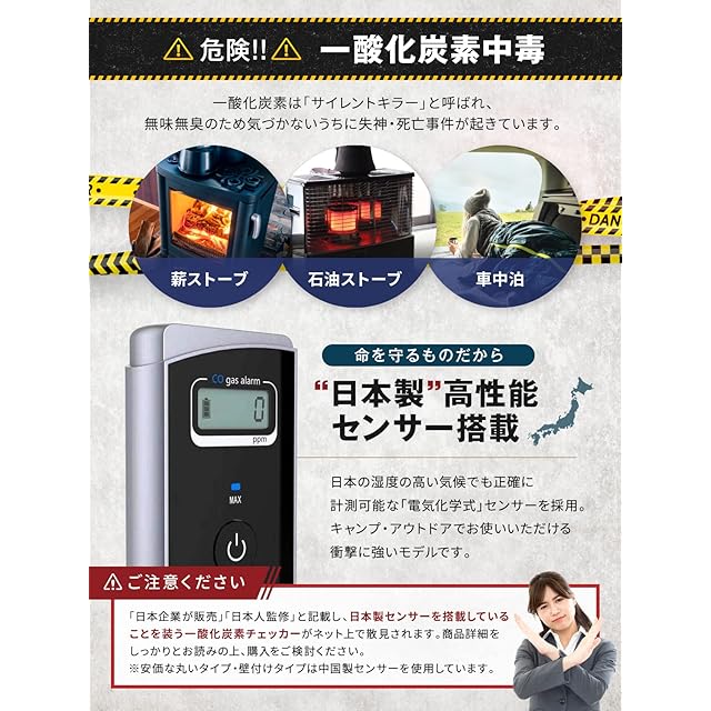 【Made in Japan 日本製 国産センサー搭載】 当社の一酸化炭素警報器は、高性能日本製センサー搭載しております。耐衝撃に強く、電気化学センサー方式を採用しているため、湿度の高い日本のアウトドアシーンでも安定して動作します。