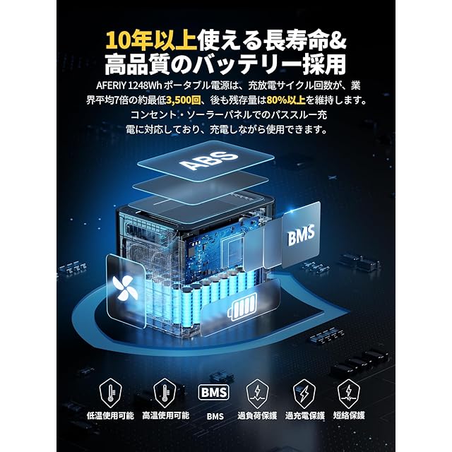 【高品質のLiFePO4バッテリー採用・長寿命 】 電気自動車にも使用されている「LiFePO4(リン酸鉄リチウムイオン電池)」が採用されており、一般的なポータブル電源の約7倍の高耐久バッテリーを実現(充放電サイクルは3,500サイクル残存量80%以上を維持しています)。一日1回使用しても、10年〜20年と末長くご使用いただけます。本製品は電池だけでなく、数千と使われる内部電子部品の発熱抑制や堅牢で耐衝撃性能の高い製品フレームの採用、発熱を監視/管理するBMSバッテリーマネジメントシステムの導入など、一つひとつの要素を最適化することでポータブル電源製品全体の長寿命化を実現する。安定した使い心地でいつまでも長持ちするポータブル電源をお探しの方に、ぜひご体験いただければと思います。