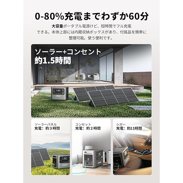 【AC+ソーラーパネルにより1.5時間で満充電】AFERIY独自技術により、AC+ソーラーパネル充電により1.5時間で満充電。なので、忙しい現代人や思い立ったらすぐに行動したい活動派の方にはぴったり。突然のキャンプや非常用でも、ポータブル電源は短時間でフル充電できてすぐに使えるのは便利ですよね。同時に、低温充電時のリチウム分解リスクや高温充電時の熱暴走リスクを低減し、マシン全体の充電の安全性を向上させました。ソーラーパネルを使用して、無限の太陽エネルギーを活用すれば、環境にもお財布にも優しい。使用時や充電時の音が53db以下の静音設計のため、アウトドアで自然の音を楽しみながらご使用いただけます。
