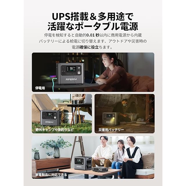 【日常レジャーから緊急時までこれ 1台・UPS0.01s】AFERIYポータブル電源1200は、無停電電源装置UPSを搭載して、電力が遮断されたり、0.01sにバックアップ電源を供給しますので、パソコン部品の破損、電子データの紛失、停電の心配がありません。 定格出力は1200W、瞬間Max出力は2400Wあるため、車用冷蔵庫、炊飯器、電気ケトル、ドライヤー、チェーンソーなど、99%の家電製品に対応できます。家庭での備えだけでなく、オフィスや自治体など多人数での利用にも有効です。LEDライトは、野外キャンプや夜釣りの照明として、災害時の警告灯としてもご利用いただけるSOSフラッシュ機能を備えています。