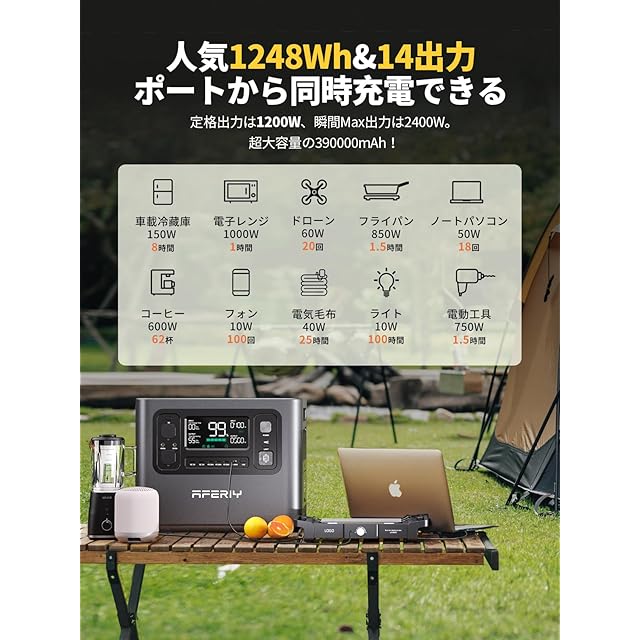 【大容量1248Wh・7年メーカー保証】AFERIYポータブル電源1200は、超大容量の390000mAh/1248Whのバッテリーを搭載し、数日間電力がない場所でも、多い電気機器でも安心で、アウトドアや災害時の電源確保に役立ちます。家庭用AC*4、USB-A*2、USB-C*4、DC5521*2、XT60*1、シガーソケット*1を含む14出力ポートから同時充電を行えます。業界をリードする7年メーカー保証ある、国内にアフターサービス部門を設けて、品質には万全を期しておりますが、万が一不良・破損・誤納品など、ご購入後何かございましたら、カスタマーサポートあるいは店舗メールアドレス お気軽にお尋ねください、確認した後、迅速に換新または返金を行います。(アフタサービス日本語電話対応)