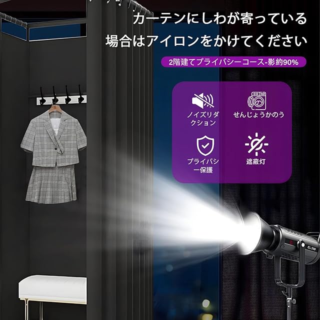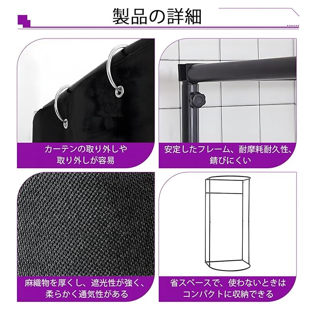 【丈夫で持ち運び可能】ローマのロッドと接触する滑らかなグロメット、内蔵のサイレンサーリング、柔軟性、静音性、耐摩耗性。ポータブル更衣室の全セットに洋服フックが付いており、ゲストやお客様が洋服や鞄などを掛けるのに便利です。とても使い勝手が良いです。
