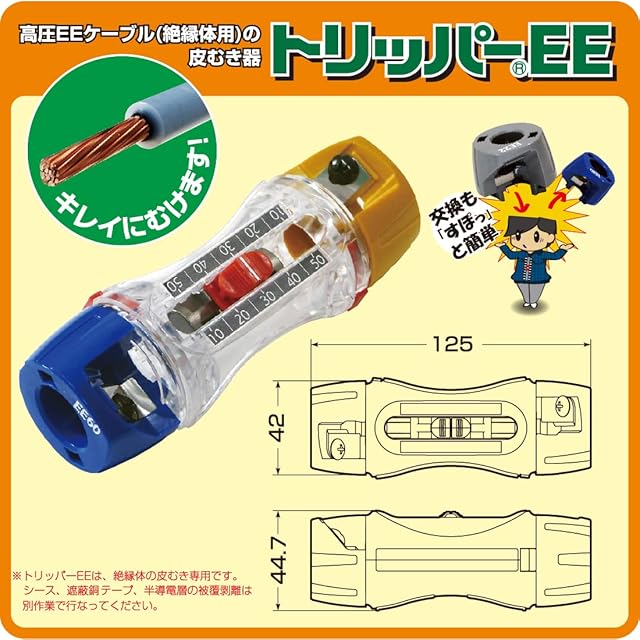高圧ケーブルEE(三層同時押出型)用絶縁体剥ぎ取り工具トリッパーEE、フルセット・ケース付き
