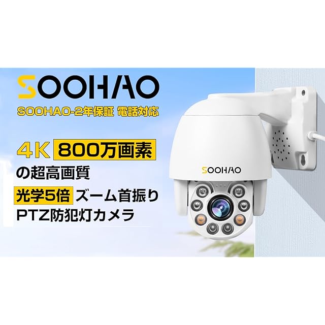 2025年版800万画素 SOOHAO 増設用 4K超 光学5倍ズーム 首振りPTZ機能 防犯灯カメラ poe給電 有線 防犯カメラ 監視カメラ 双方向通話・カラー暗視・録音・録画・暗視・IP66防水防塵・AI人体検出 屋内/屋外 2年保証 電話サポート対応