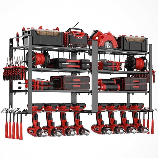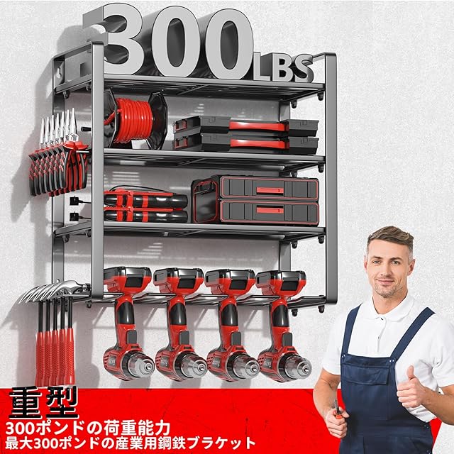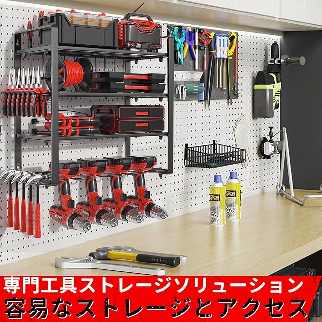 Rxakudedo 頑丈な電動工具ウォールマウント、8ドリルビットウォールマウント、ガレージ、作業場、ペグボード、小屋での整理用の4層ツールオーガナイザーと収納ラック