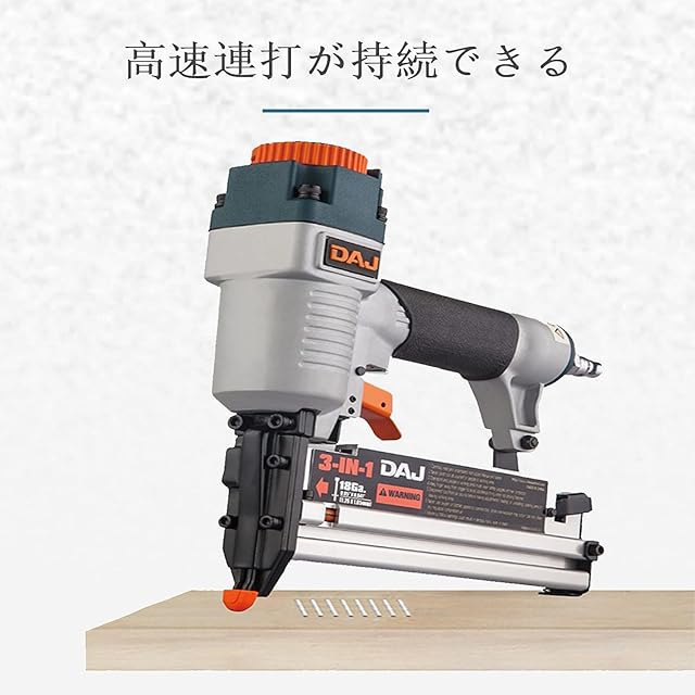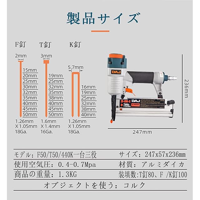 一台三役、サイズ:247mm×238mm×57mm、重さ:1.33 KG、空気圧範囲:4~10キロ(0.4~1.0MPa)、弾倉量:F 釘:100枚、T釘:80枚、K釘:100、枚釘の長さ:F釘(仕上釘)2mm*15~50mm、T釘3mm*19~50mm、K釘(ステープル)4mm*16~40mm