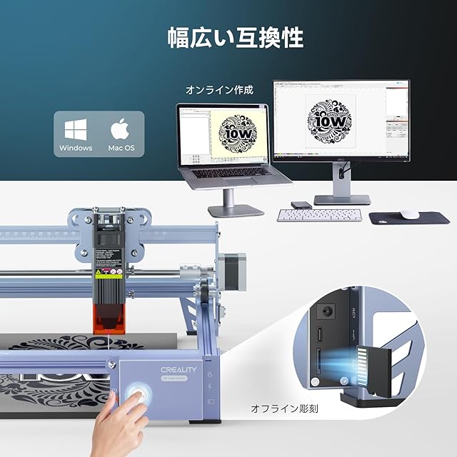 【幅広い互換性】LightBurnやLASERGRBLなどのプロの彫刻ソフトウェアと互換性があり、MacOSおよびWindowsシステムをサポートしています。さらに、オフラインの創造性をサポートします。TFカードを挿入して電源ボタンをクリックするだけで、クリエイティブな作業を開始できます。初心者や中小企業に適しています。