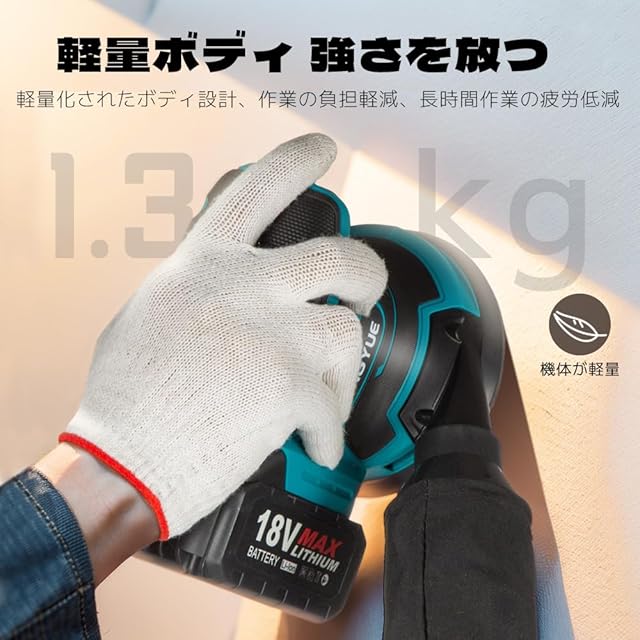 【ご注意】本体を手の押す力より大きくなるながら、本体の回しはだんだん弱くなります。 手の押す力が大きすぎる場合、製品の回転が停止になり、製品内部の元件を磨耗されるおそれがあります。 なので、押す場合、適当的な力を入れてください。ご注意:ランダムサンダーはオービタルサンダーの偏心運動に加えより研磨作業を進めます、 本体は偏心運動で緩い回転になります。作業に手が本体を握るので、偏心運動で手が衝撃力が感じます。減振手袋を付くことをお勧めます。