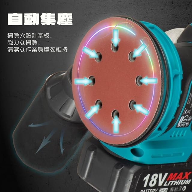 【洗練されたデザイン】 1.耐摩耗性のあるゴムと良質なabsの組み合わせ、ゴム表面にレーザー彫刻技術があり、摩擦力を大幅に向上させ、滑り止めます。 2.強力なブラシレスモーターを採用:普通のブラシレスモーターに比べて省エネで耐久性があります。 3.集塵システム:取付式の集塵ボックス付き、研磨する面に開いている穴から粉塵を吸引し、集塵ボックスにためておくことができるので、削り粉の飛散が抑えられ、 片付けもスムーズに行えます。 4.換気冷却システム:稼働中に発生する熱を減少させ、換気冷却システムにより機械の寿命を延ばせます。