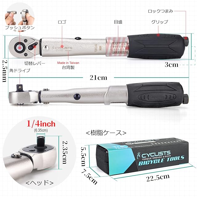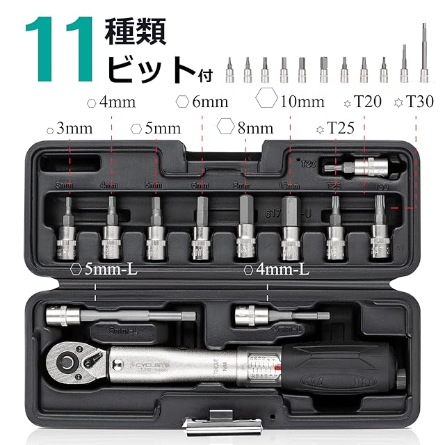 CYCLISTS 自転車 トルクレンチセット 差込角6.35mm 2~24N・m ロック機能 ラチェット式 プリセット型 ビット11個付 ロードバイク用 ケース付 (CT-T02)