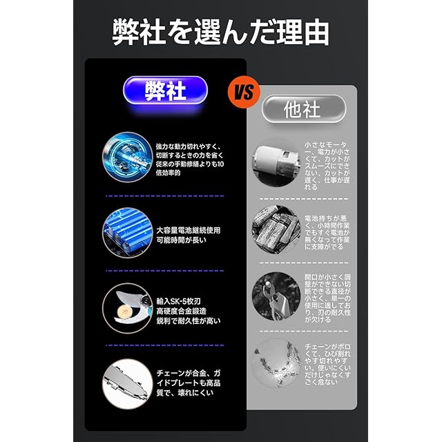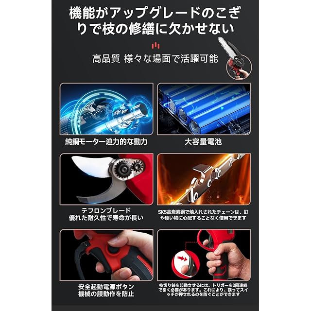 【高性能モーターと耐久チェーンでパワフルな切断】 高枝切り電動チェーンソーには、高品質な純銅ブラシモーターを採用しており、優れたパワーと耐久性を発揮します。高硬度チェーンとの組み合わせにより、滑らかでスムーズな切断が可能。過熱を防ぐため、連続使用後には10分程度の休憩を推奨しています。高枝切り電動チェーンソーを長持ちさせるための大事なポイントです。