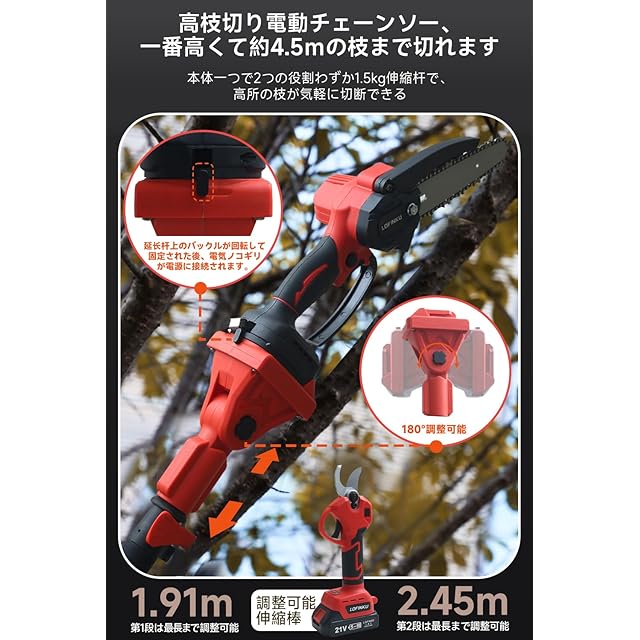 【1台で多機能作業!伸縮自在な高枝切り電動チェーンソー】 この高枝切り電動チェーンソーは、電動チェーンソーと電動ハサミの2つの役割を兼ね備え、付属の2.4m伸縮ポールによって、地上から高い枝にも楽に届きます。ポールは1.94m~2.45mまで自由に調整でき、180°回転するヘッドで、多様な角度からのカットをサポートします。高枝切り電動チェーンソー1台で剪定、伐採、整枝をスマートに行えます。