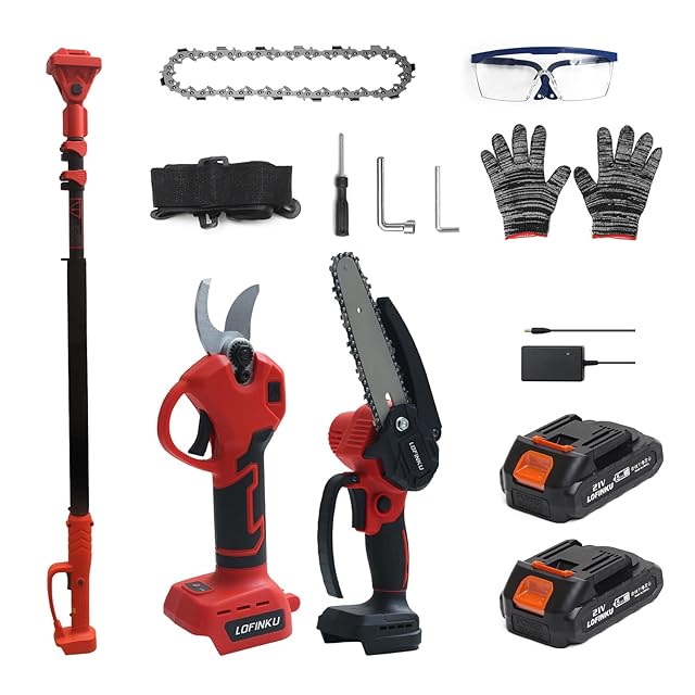 【付属品充実で安心サポート】 高枝切り電動チェーンソーのパッケージには、電動チェーンソー本体、電動ハサミ、伸縮ポール、2つのバッテリー、充電器、取扱説明書、安全眼鏡、替えチェーン、ドライバー2本、作業手袋が含まれています。電池の劣化防止のため、1ヶ月に1度の充電を推奨。万一商品に不具合があった場合も、高枝切り電動チェーンソー購入後は迅速な対応をお約束します。