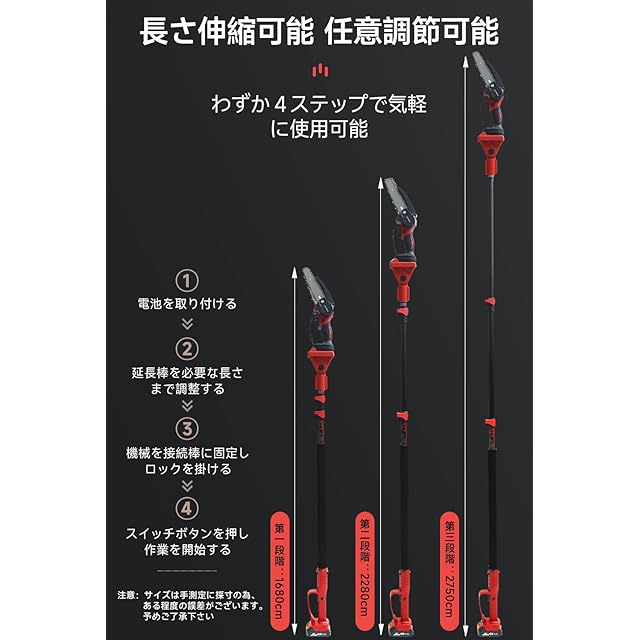 高枝切り電動チェーンソー 充電式 高枝 チェーンソー 高枝切りバサミ たかえだ 電動 3段階調節可能 伸縮式延長ポール付き 充電式 チェーンソー 電動ハサミ 30mm HY2