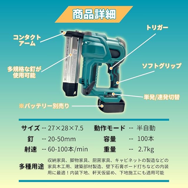 マキタ Makita 対応 コードレス タッカー ネイラー 電動 釘打ち機 エアタッカー ネイル ステープル 対応 フィニッシュ 18V バッテリー 互換 家庭用 工具 ※ 充電器 バッテリー 別売り