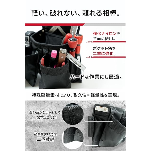 ✅【軽い、破れない、頼れる相棒。】高耐久性の『特殊ナイロン素材』。特殊軽量素材使用により耐久性×軽量化を実現。頑丈かつ軽量な製品を実現。頑丈設計&ポケットの角には強化裁縫で工具による破損を防ぎます。