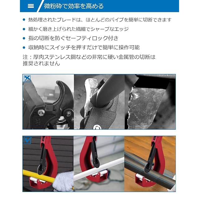 【ご注意】厚肉ステンレス鋼などの非常に硬い金属管の切断には使用できません。紙製のような支えられていないチューブはカットできないことをご了承ください。