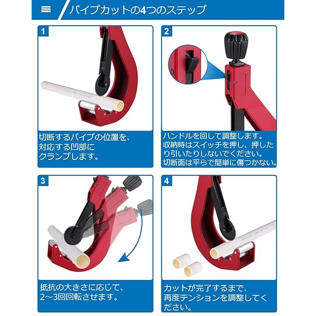 【軽く力が無くても使いやすい】滑り止め付きハンドルで持ちやすいです。パイプを軽い力で回せて、簡単に切断できます。