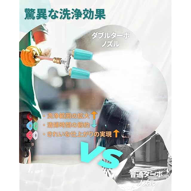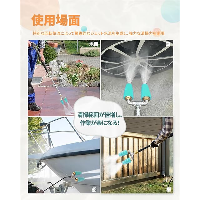 【幅広い清掃用途】 自動車、船舶、地面、壁、溝、農業機械、建築施設の表面の頑固な汚れや粘土を簡単に取り除くのを役立ちます。高圧洗浄機用ダブルターボノズルは、プロフェッショナルから初心者まで幅広く使いやすく設計されており、非常に汎用性があり、時間を節約し、清掃作業をより効率的かつ簡単にします。