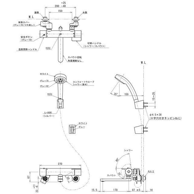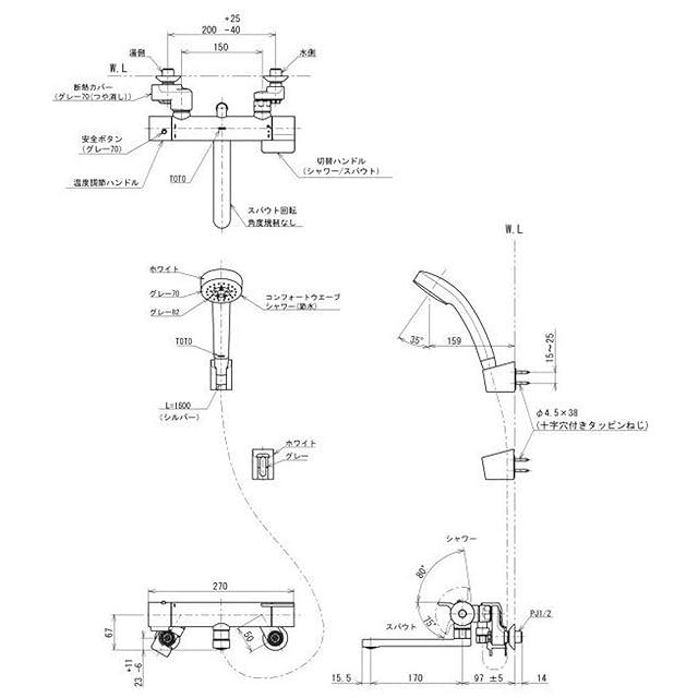 TOTO 浴室用 壁付サーモスタット混合栓 コンフォートウエーブシャワー TBY01402J